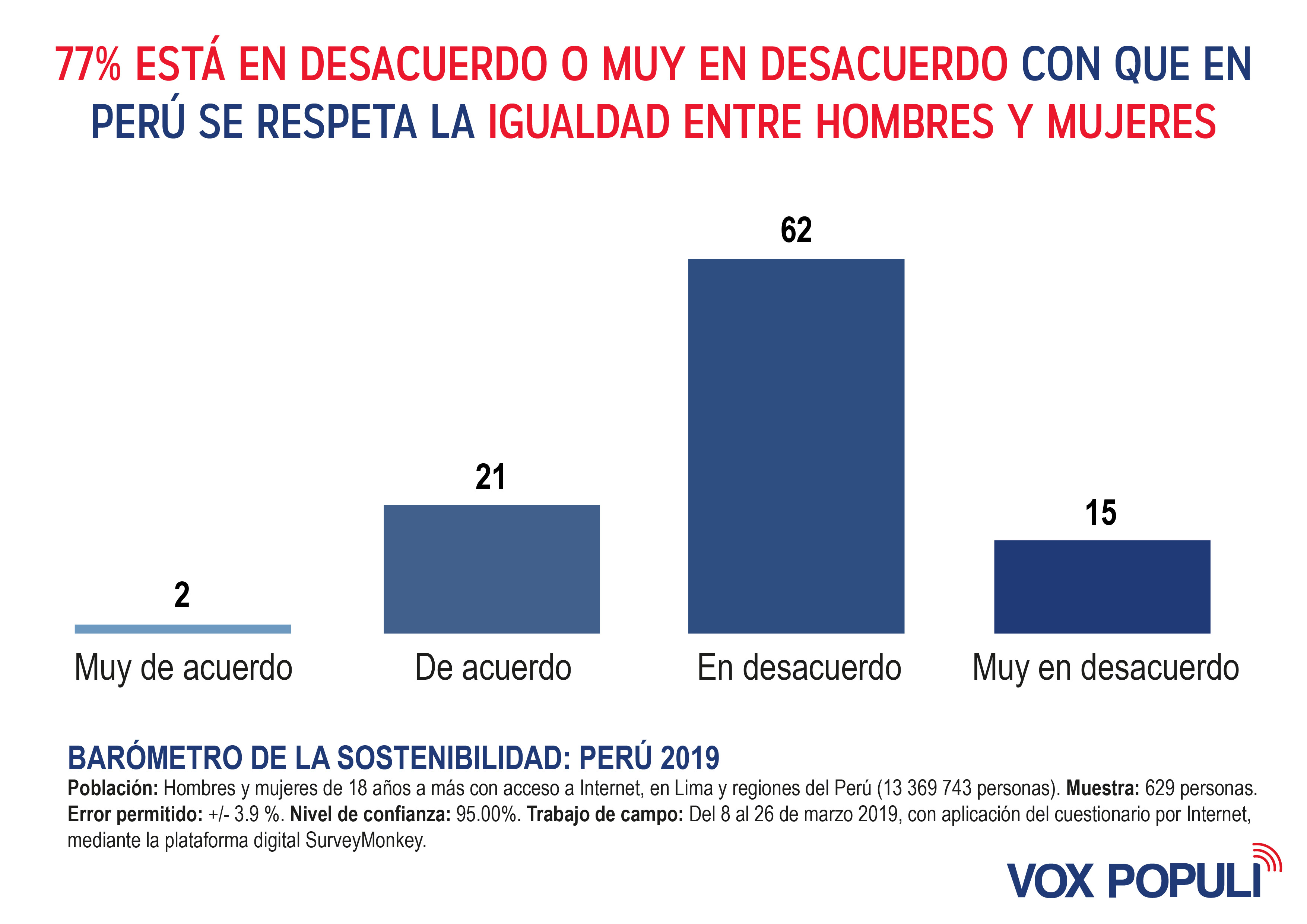 El 77% de peruanos considera que no existe igualdad entre hombres y mujeres, según estudio realizado por Vox Populi Consultoría. El índice de Desigualdad de Género del PNUD (Informe Mundial de Desarrollo Humano 2015), de los 17 países que conforman América Latina, Perú se encuentra en el puesto diez en igualdad de género, acercándonos a países como El Salvador. Nuestro índice es 0.420; luego de Ecuador y antes de Guatemala (INEI, 2017). En este índice, la mayor cercanía a 0 significa mayor igualdad.