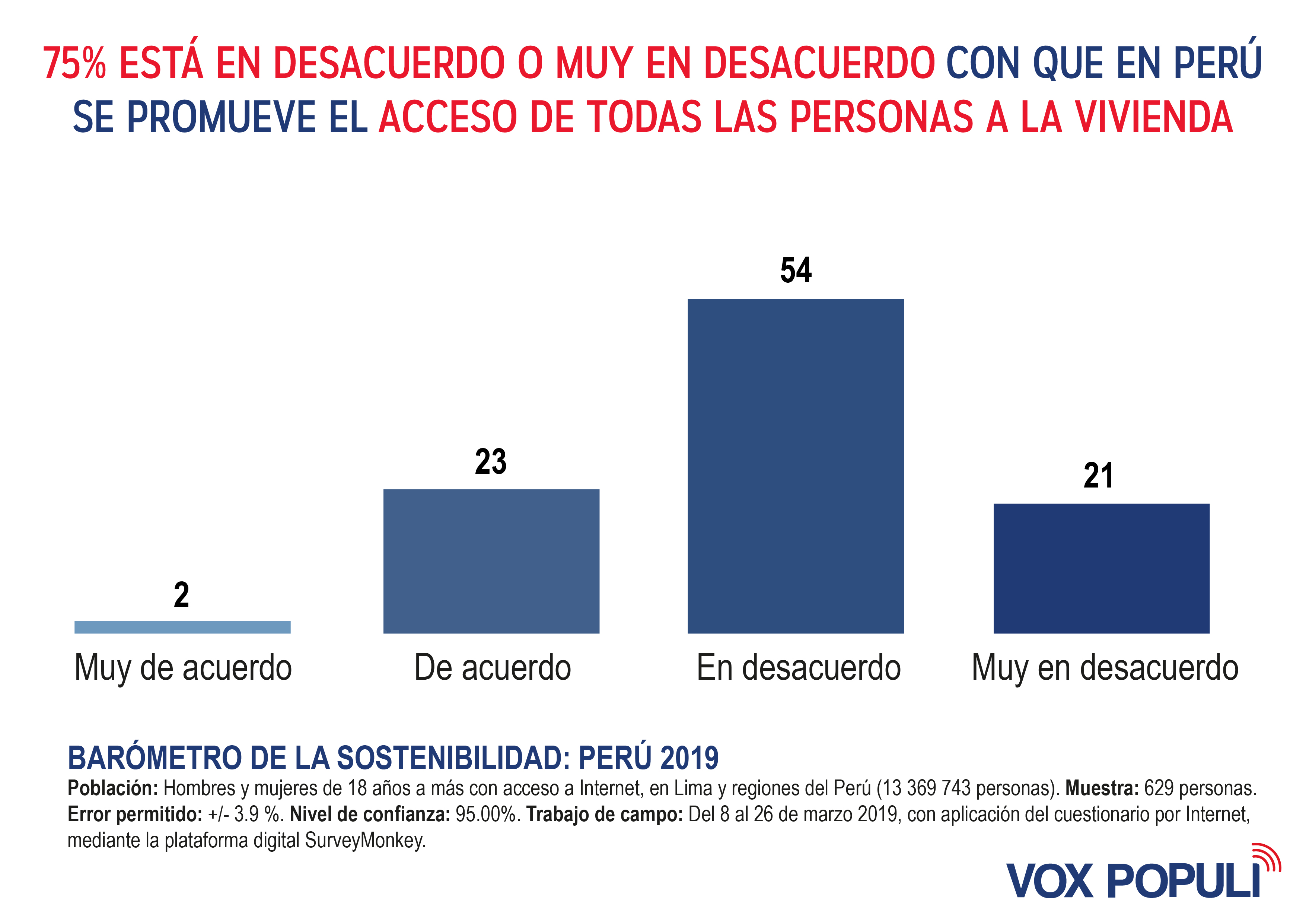 Según un estudio realizado por Vox Populi Consultoría, el 54% de la población está en desacuerdo en que las políticas de gobierno ayuden a los ciudadanos a tener una vivienda. Cabe señalar que después de Nicaragua y Bolivia, Perú ocupa el tercer puesto como país con mayor déficit de casas en América Latina. Según estadísticas del Banco Mundial, tres de cada diez personas no tienen baño en su hogar.