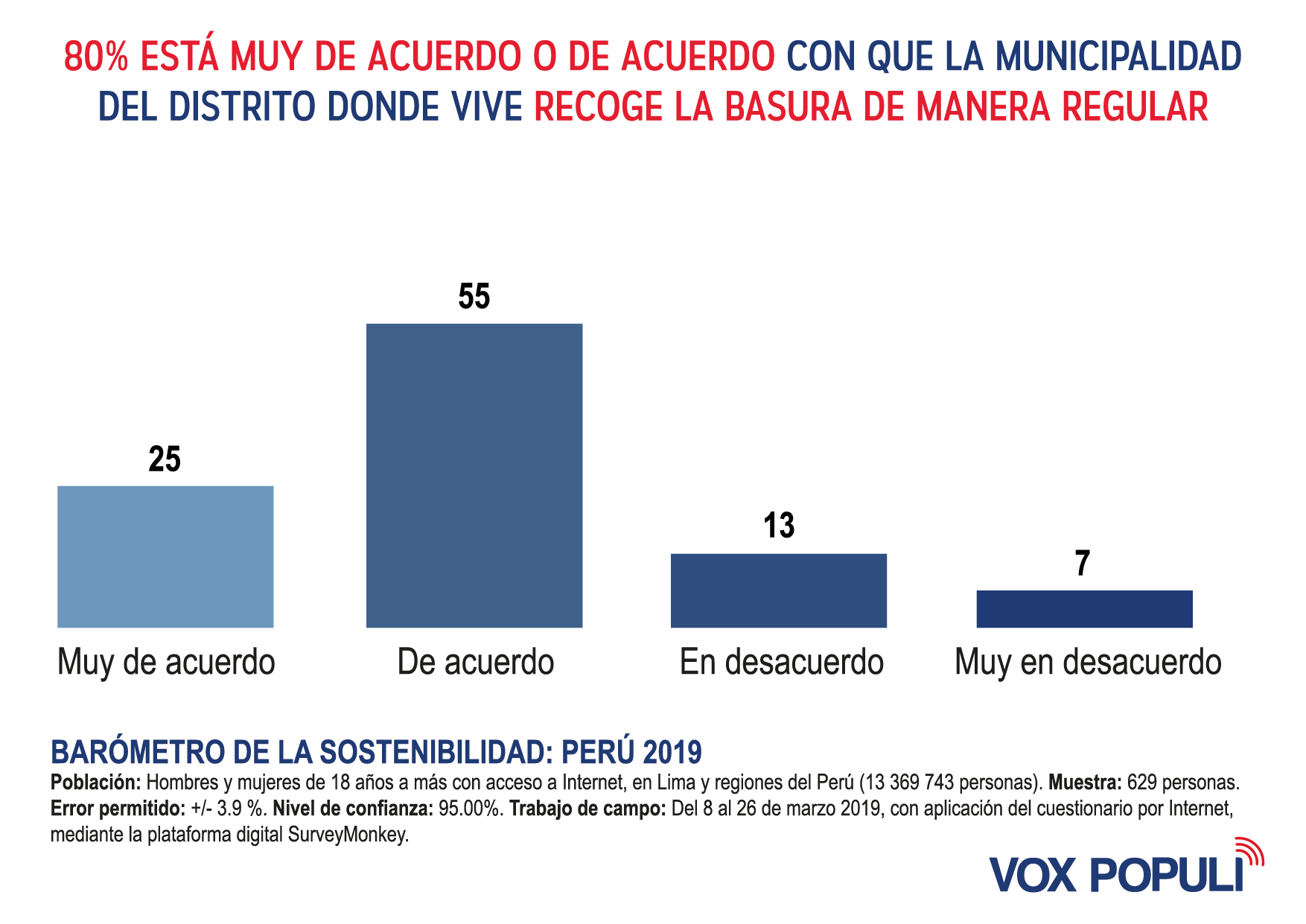 Según el estudio realizado por Vox Populi Consultoría, el 80% de la población peruana considera que en su distrito se recoge la basura de manera regular. Cabe acotar que acá se produce un promedio de 23 mil toneladas diarias de basura, de las cuales ocho mil corresponden a Lima, que cuenta con cuatro rellenos sanitarios.