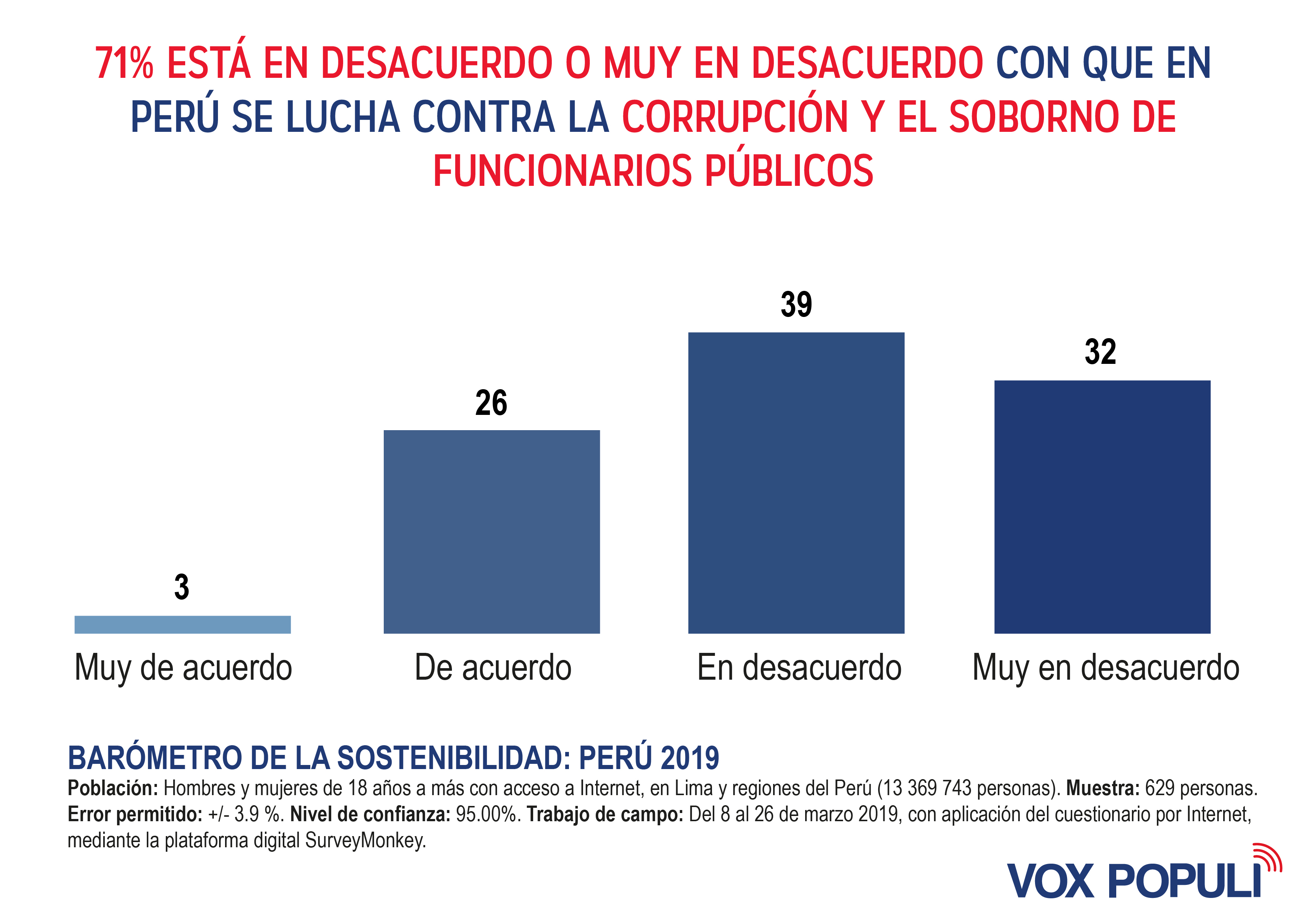 Según un estudio realizado por Vox Populi Consultoría, el 71% de los peruanos considera que no se está luchando contra la corrupción. Es oportuno mencionar que este mal es un problema estructural en la sociedad peruana, que ocurre en todos los niveles de las instituciones políticas.