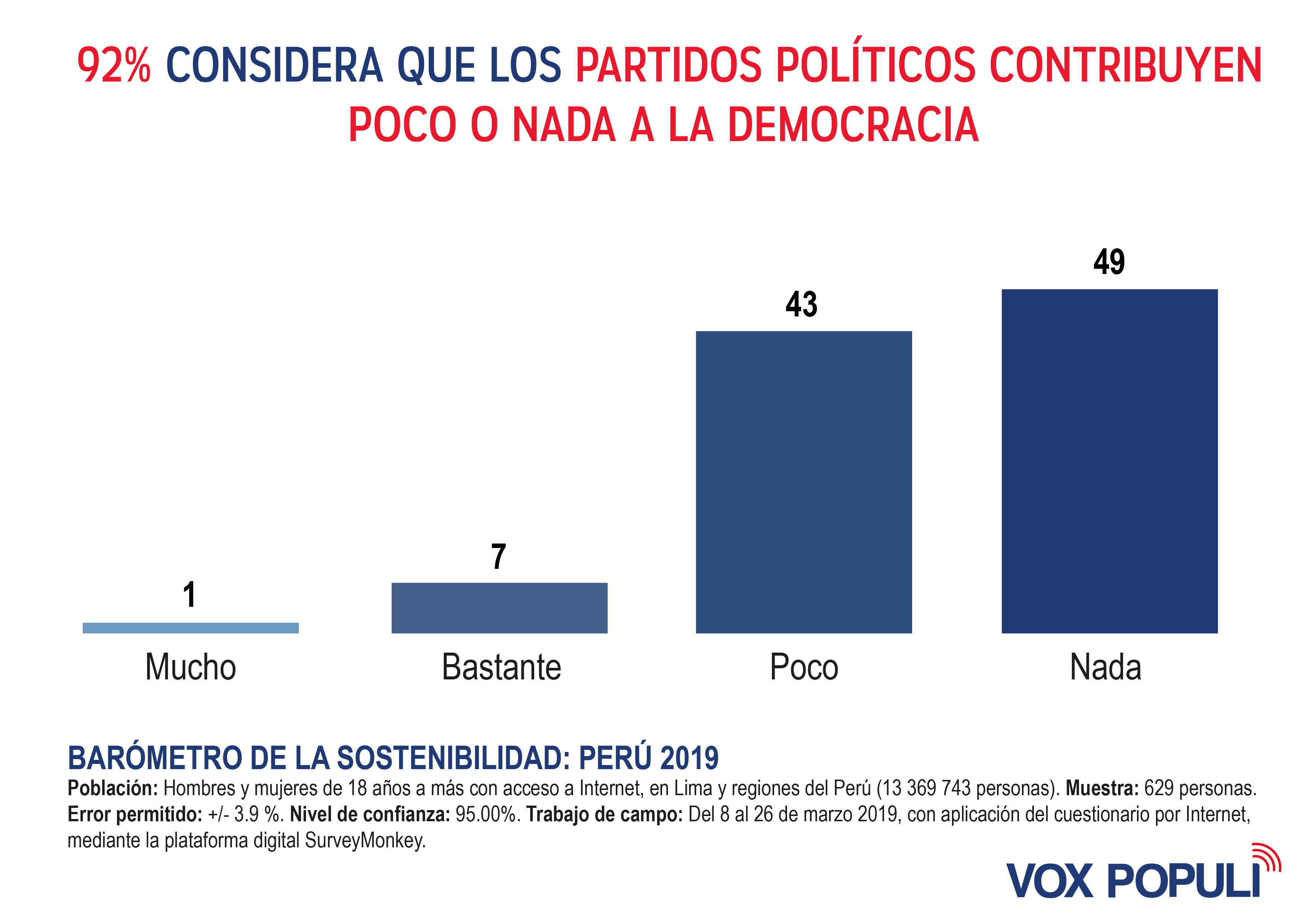 Según estudio realizado por Vox Populi Consultoría, el 92% de los entrevistados considera que es poco o nada lo que contribuyen los partidos políticos a la democracia. El desprestigio en los últimos años, lleva a una opinión de rechazo casi absoluta.