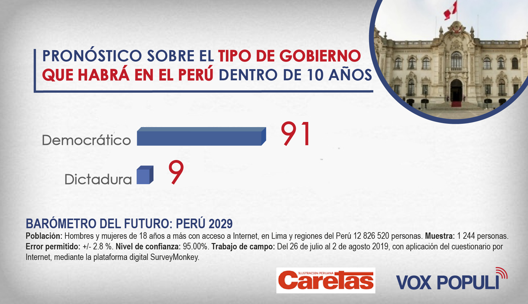 Según estudio realizado por Vox Populi Consultoría, el 91% de la población considera que en el Perú seguirá habiendo un régimen democrático en los próximos 10 años. Las expectativas políticas del país están en la democracia y el equilibrio ideológico.