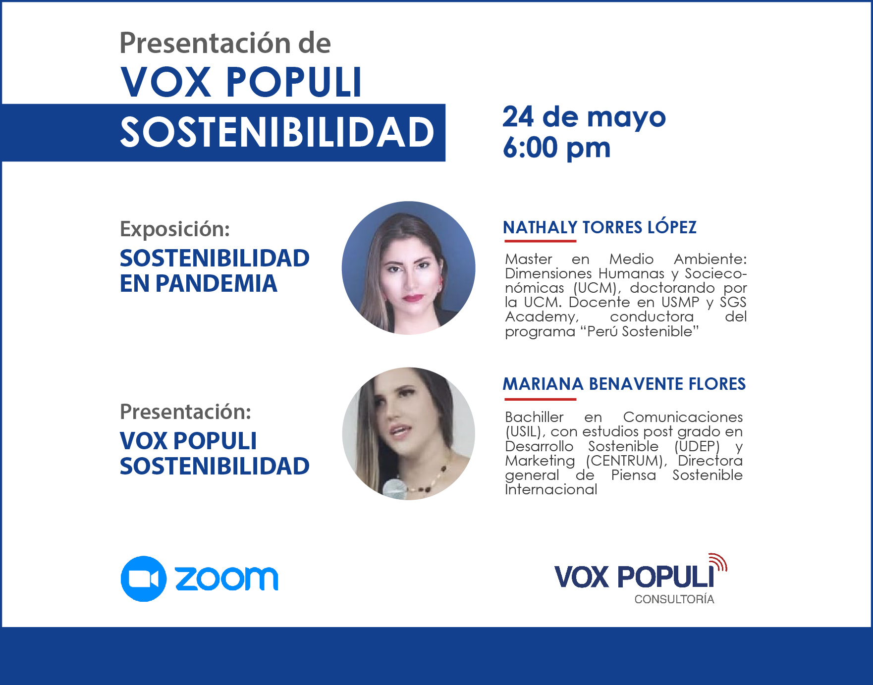 Vox Populi Consultoría presenta su nueva división Vox Populi Sostenibilidad, en la que Nathaly Torres expondrá sobre «Sostenibilidad en Pandemia», este lunes 24 a las 6.00 pm, a través de la plataforma Zoom. Los interesados en la materia pueden unirse al evento con el siguiente enlace: