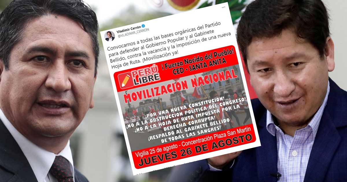 El secretario general del partido político Perú Libre, Vladimir Cerrón, convocó a las bases orgánicas del partido a una marcha en defensa del gabinete ministerial liderado por Guido Bellido. Según la convocatoria, el evento iniciará con una vigilia el miércoles 25 de agosto que se llevará a cabo en la Plaza San Martín. La marcha a favor del gobierno y en defensa del gabinete Bellido se realizará el jueves 26 de agosto, día en el que el premier acudirá al Congreso a pedir el voto de confianza.