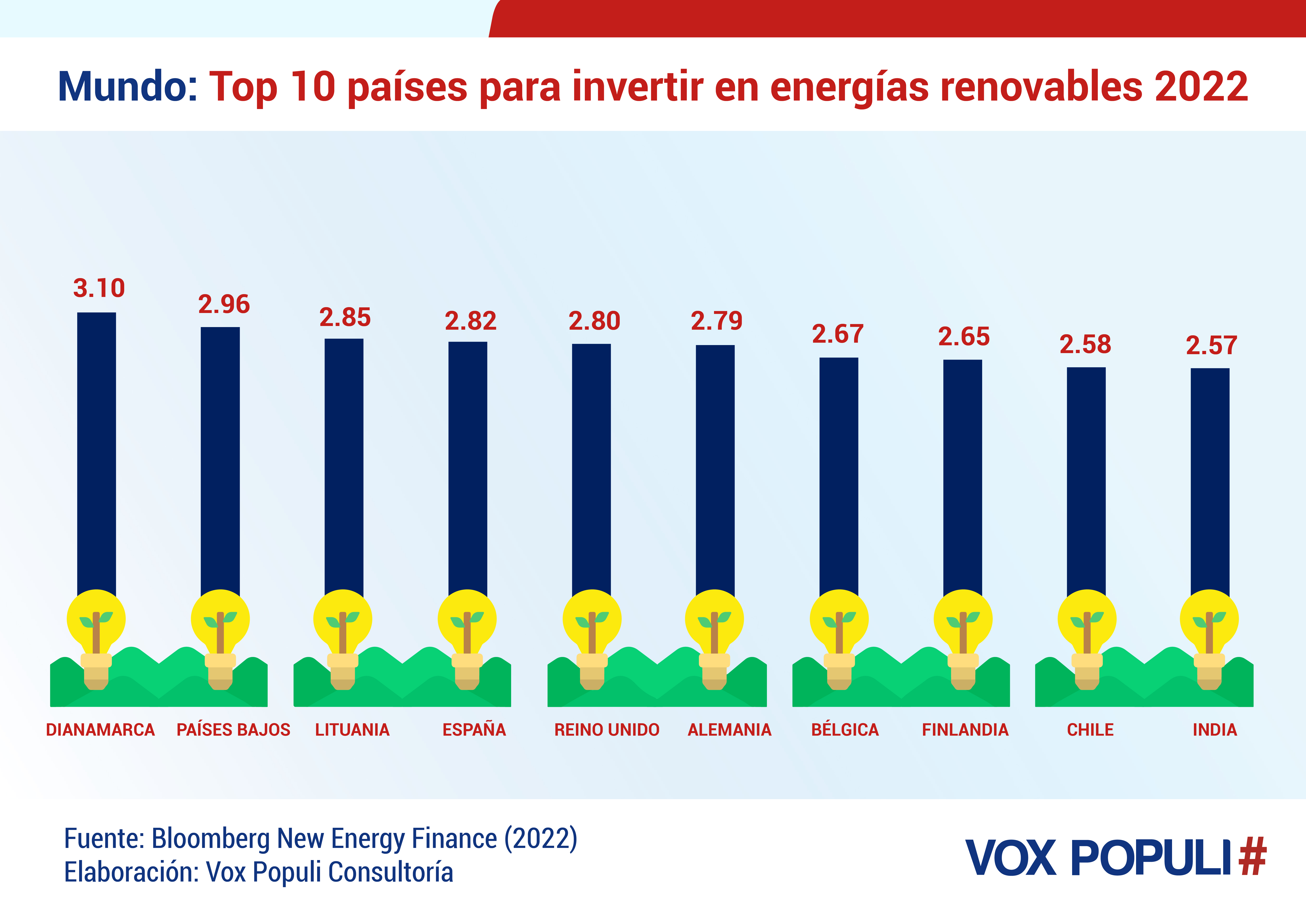 Vox Populi Mundo: Top 10 países para invertir en energías renovables 2022 by voxpopuliempresarial30 noviembre, 2022 Comments 0 Ranking mundial de países para invertir en energías renovables, desarrollado por BloombergNEF luego de evaluar 136 países. Elaboración: Vox Populi Fuente: https://global-climatescope.org/ Compártelo: Share on X (Se abre en una ventana nueva) X Share on Facebook (Se abre en una ventana nueva) Facebook Share on LinkedIn (Se abre en una ventana nueva) LinkedIn Share on WhatsApp (Se abre en una ventana nueva) WhatsApp Más Share on Telegram (Se abre en una ventana nueva) Telegram Me gusta:Me gusta Cargando... 0 comments on “Mundo: Top 10 países para invertir en energías renovables 2022” Deja un comentarioCancelar respuesta Navegación de entradas Previous Post Next Post