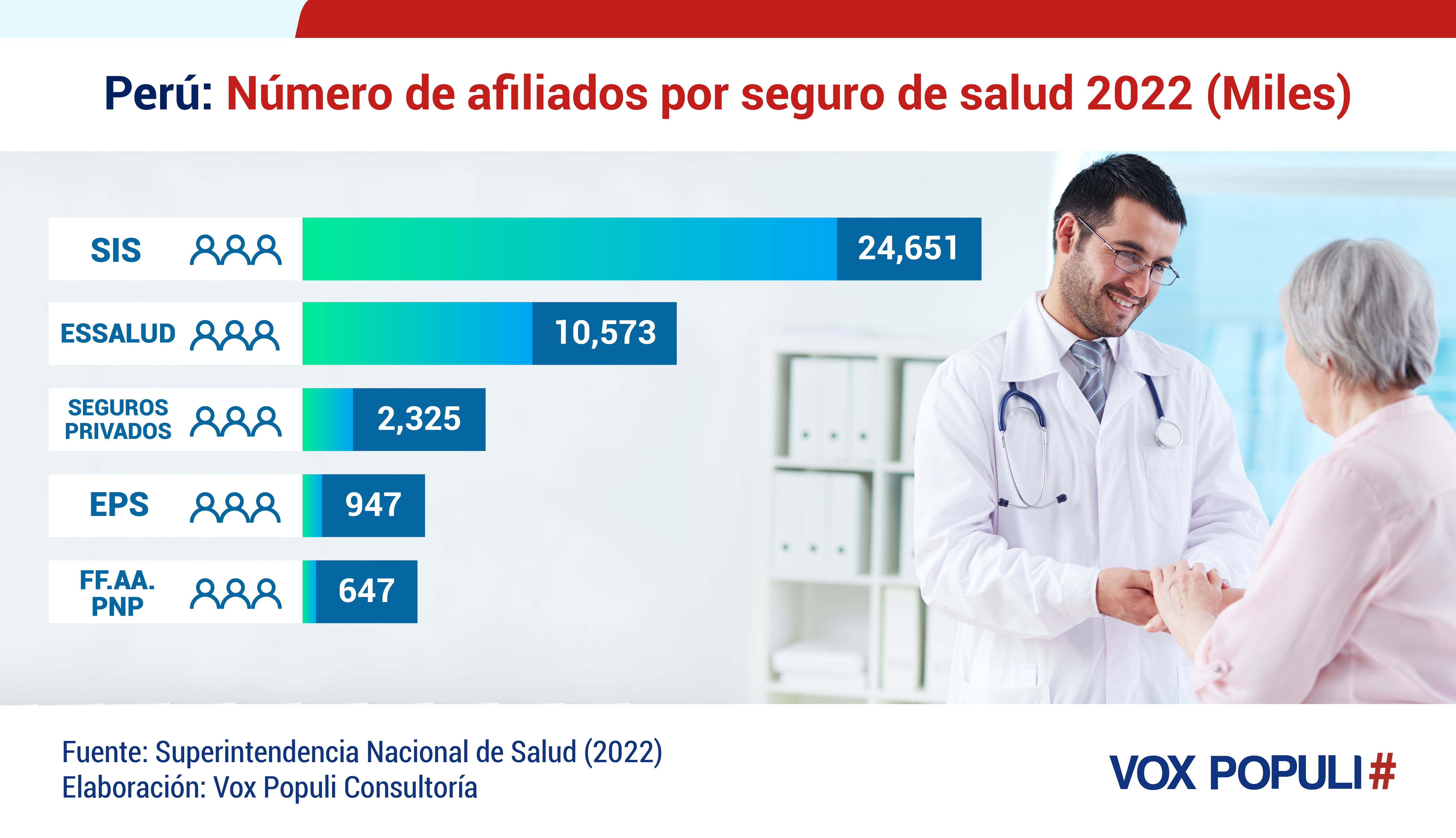 El Sistema Integral de Salud (SIS) y EsSalud son los dos seguros de salud con mayor número de afiliados en Perú, mientras los seguros privados llegan solo al 10% de la población.