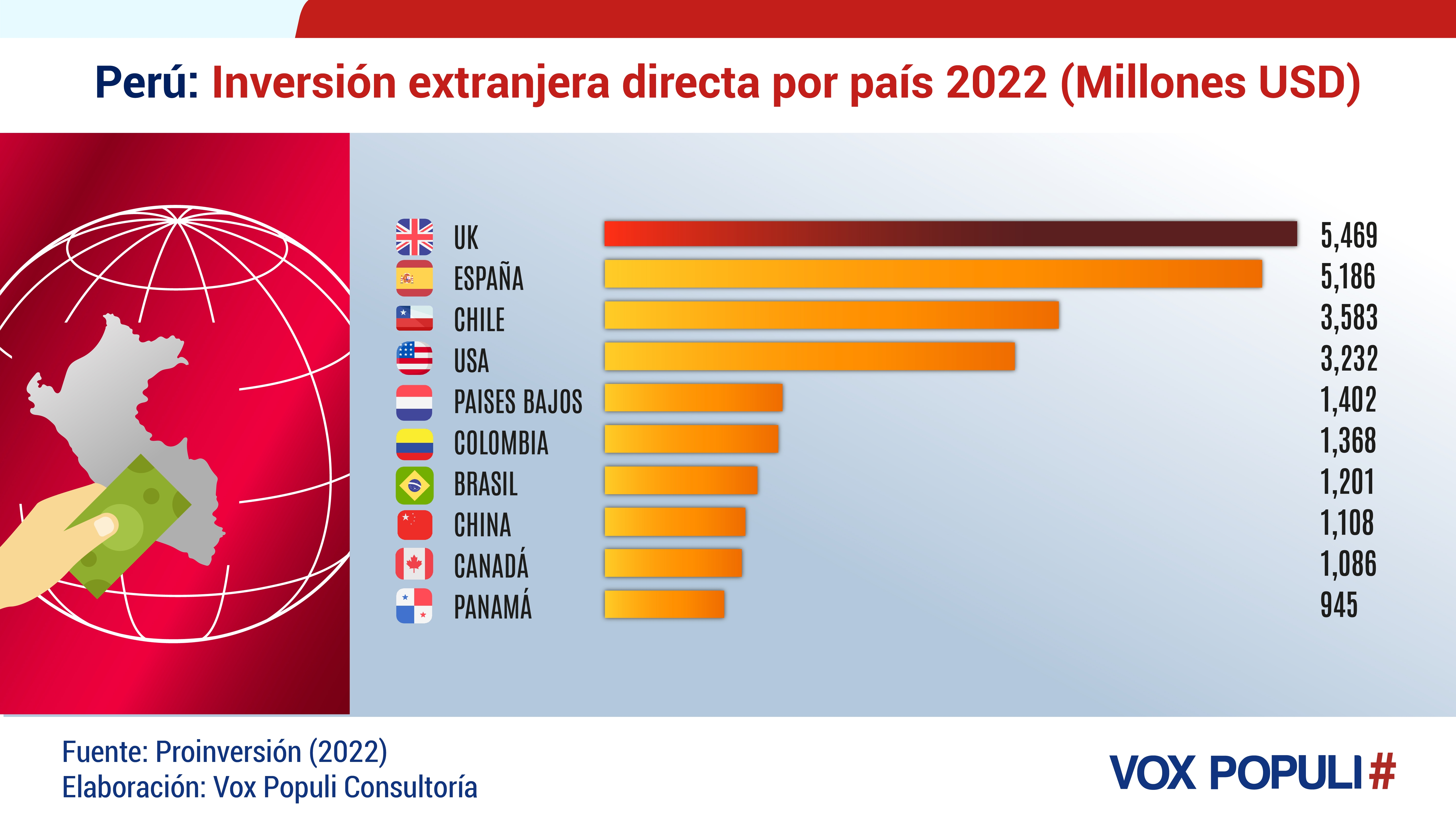 Reino Unido, España, Chile y Estados Unidos son los países que lideran el ranking de inversión extranjera directa en Perú 2022. China ocupa el octavo lugar.