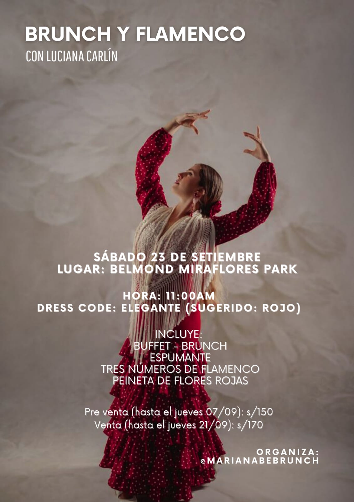 Vox Populi «Brunch y Flamenco» de MarianaBe by voxpopuliempresarial5 septiembre, 2023 Comments 0 No te pierdas «Brunch y Flamenco» de MarianaBe, el sábado 23 de setiembre en el hotel Belmond. Pre venta con descuento hasta el jueves 7 de setiembre. WhatsApp: 975 555 360 Compártelo: Share on X (Se abre en una ventana nueva) X Share on Facebook (Se abre en una ventana nueva) Facebook Share on LinkedIn (Se abre en una ventana nueva) LinkedIn Share on WhatsApp (Se abre en una ventana nueva) WhatsApp Más Share on Telegram (Se abre en una ventana nueva) Telegram Me gusta:Me gusta Cargando... 0 comments on “«Brunch y Flamenco» de MarianaBe” Deja un comentarioCancelar respuesta Navegación de entradas Previous Post Next Post