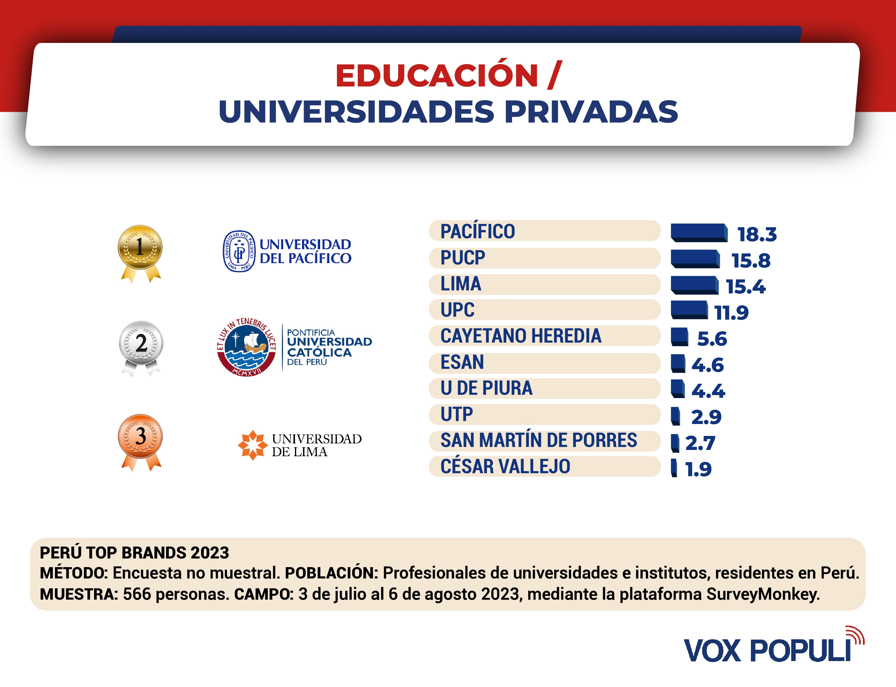 La Universidad del Pacífico obtuvo el primer lugar como la mejor marca en la categoría «Universidades Privadas», en «Perú Top Brands 2023», un estudio de la División de Investigación de Mercado de Vox Populi Consultoría.