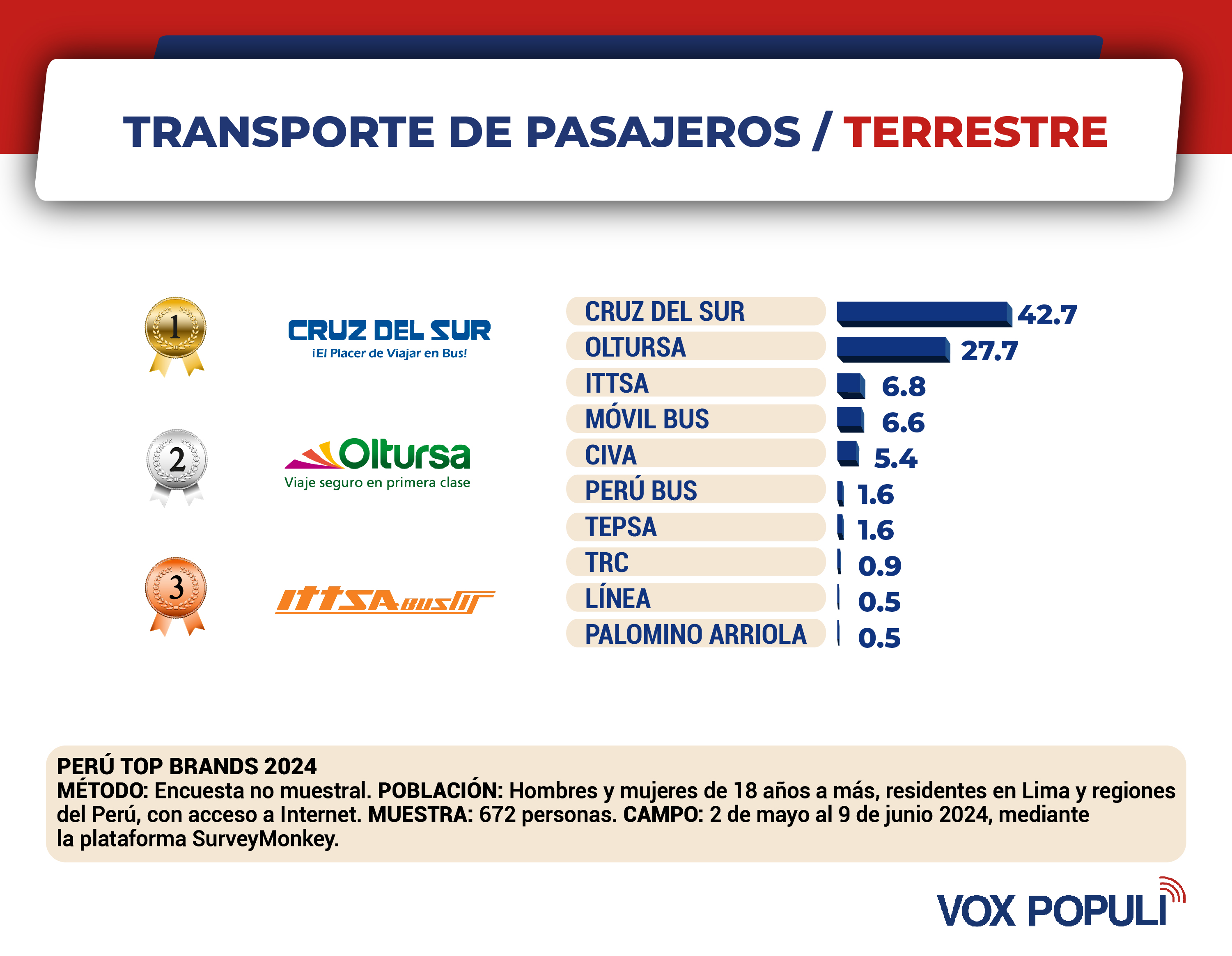 Cruz del sur es la mejor marca en la categoría de transporte terrestre, para los consumidores peruanos, en «Perú Top Brands 2024», un estudio de la División de Investigación de Mercado de Vox Populi Consultoría.