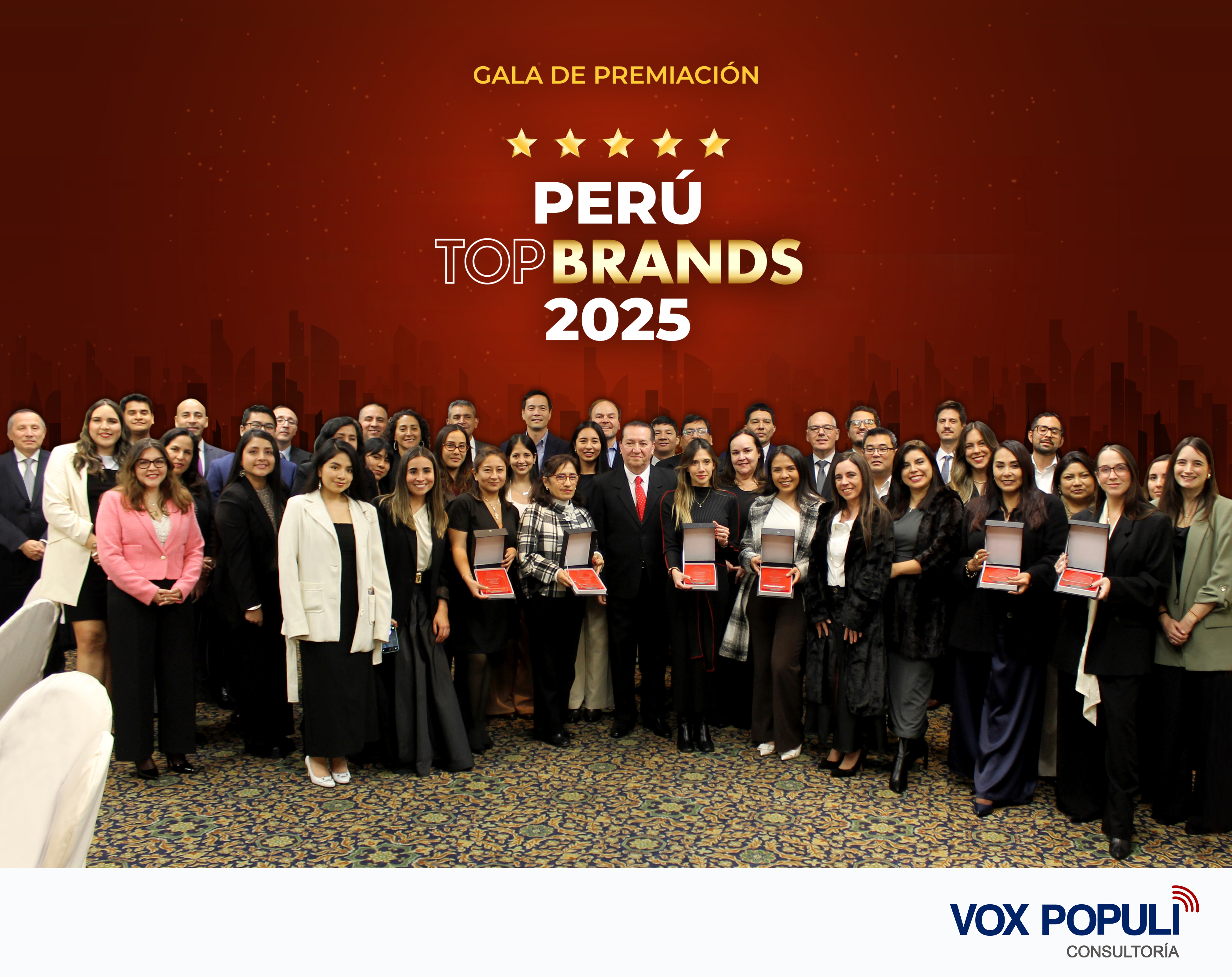 Foto oficial de la Gala de premiación de las mejores marcas del Perú, de acuerdo con el estudio Perú Top Brands 2025, realizado por la División de Investigación y Estrategia de Mercado de Vox Populi Consultoría.